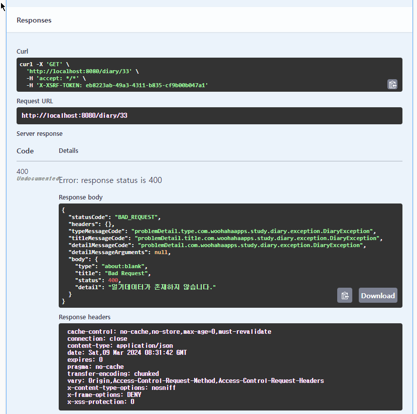 DiaryException 예외를 처리해서 badRequest() 함수를 호출하면 400 응답코드가 내려가게 돼. DiaryException 이 아닌 나머지 예외시에는 internalServerError() 함수를 호출해서 500 응답코드가 내려가게 수정했어.
