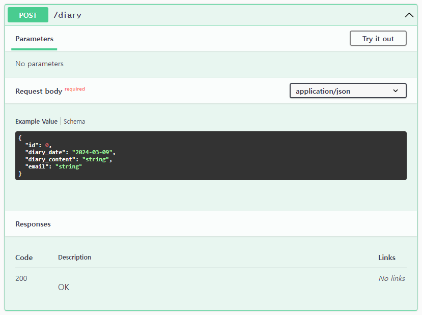 swagger UI 를 통해서 CreateDiary (POST method) 를 테스트해볼께.
