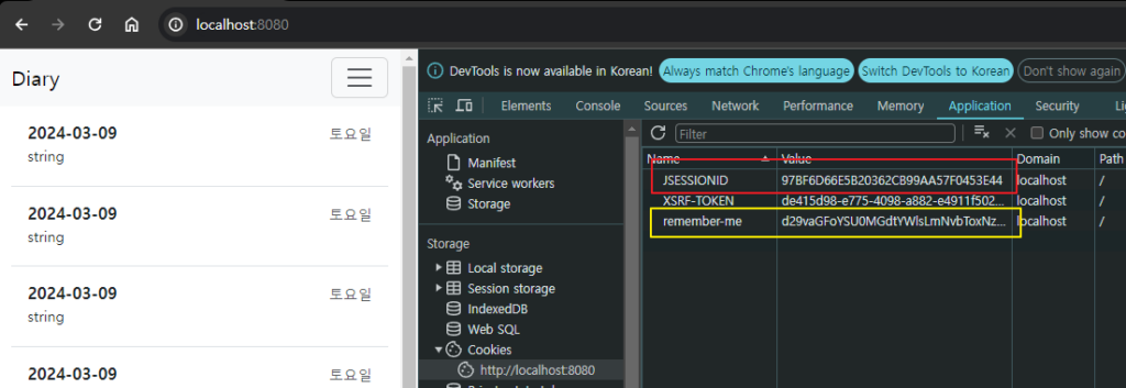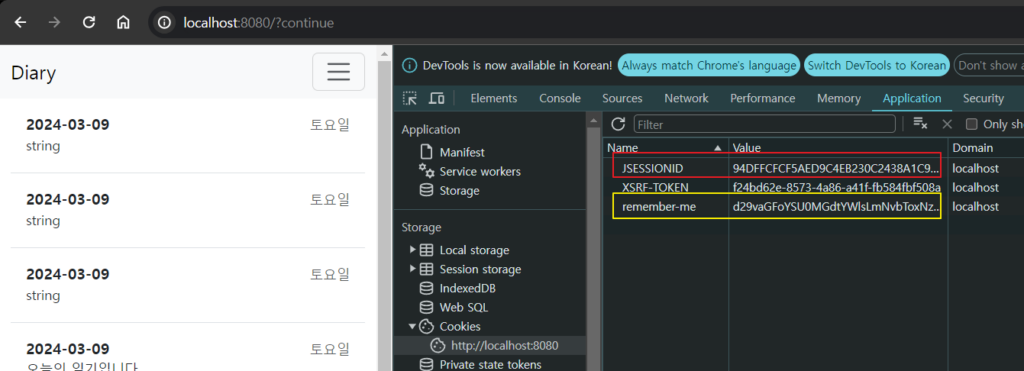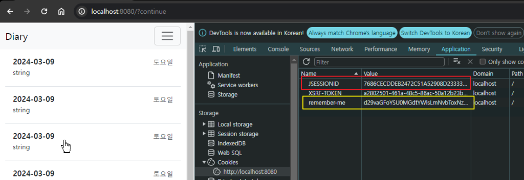위 스크린샷은 웹브라우저를 종료했다가 다시 띄워서 diary 에 접속한 상태인데, JSESSIONID 는 변경되었는데, remember-me 토큰값은 유지되고, 로그인 화면도 표시가 되지 않았어.