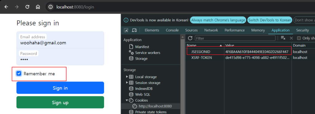 remember-me 쿠키가 생성된 것을 볼 수가 있어.