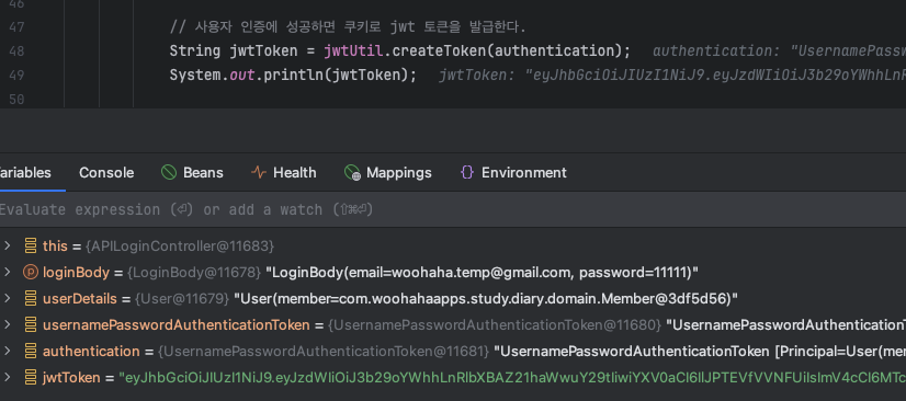 jwt 토큰으로 생성된 값은 아래 코드에서 확인할 수가 있어.