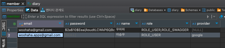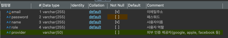 provider 컬럼에는 외부 인증을 하는 경우 외부 인증 정보 제공자 예를 들면, google, apple, kakao 등의 정보가 저장된다.
