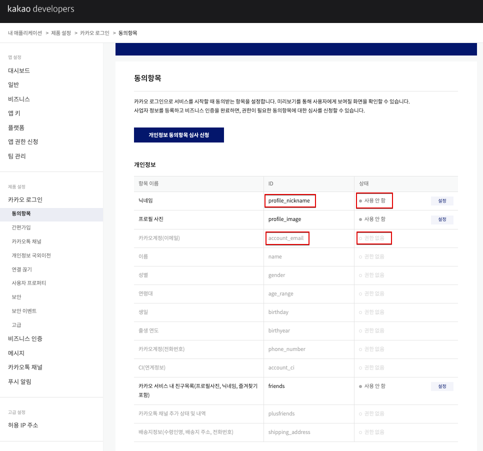 카카오 개발자 센터로 로그인해서 "내 애플리케이션 > 제품 설정 > 카카오 로그인 > 동의항목" 페이지로 이동해보자.