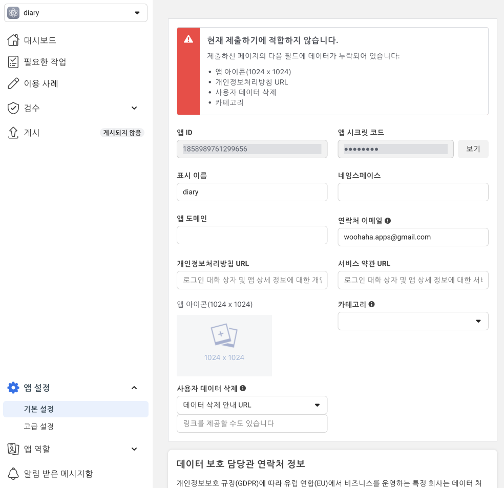 앱 만들기 - 앱 이름, 앱 연락처 이메일