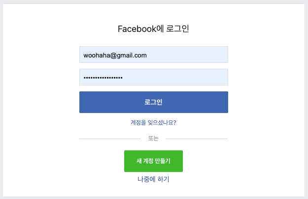 로그인 화면에서 Facebook 버튼을 클릭하면 facebook 로그인 화면으로 이동(Facebook 로그인이 되어 있지 않은 경우에만)되고,