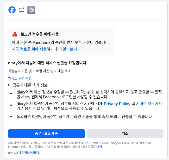 facebook 로그인에 성공하면 로그인한 계정으로 계속할 것인지를 확인한다.