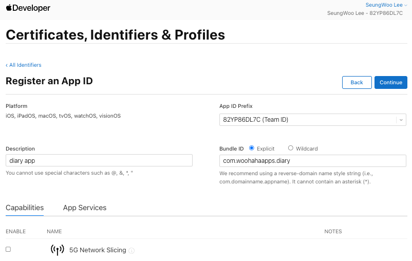 App ID 를 생성하기 위한 정보로는 App ID Prefix 로 사용할 TeamID 선택과, Description, Bundle ID 가 있다.