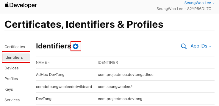 Identifiers 메뉴 화면으로 이동하여 App ID 를 생성한다.