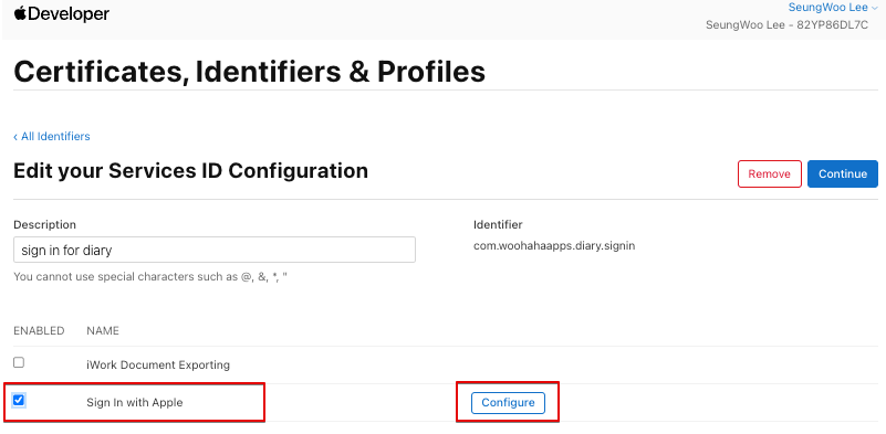 Identifier 에는 App ID 와 같은 값을 입력할 수 없으므로 signin 서비스라는 것을 명확히 알 수 있도록 .signin 을 추가로 붙여준다.