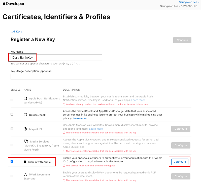 + 버튼을 클릭하여 새로운 Key 생성 단계로 넘어가서 Key Name 으로 DiarySignInKey 라고 입력하고, Sign in with Apple 항목을 체크표시하면 그 오른쪽에 Configure 버튼이 활성화된다.