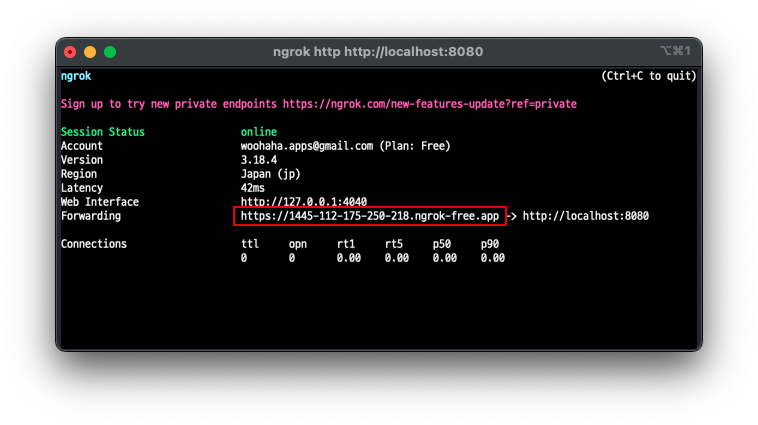 이제 ngrok 을 실행시켜서 외부에서 접근 가능한 환경을 구성한다.