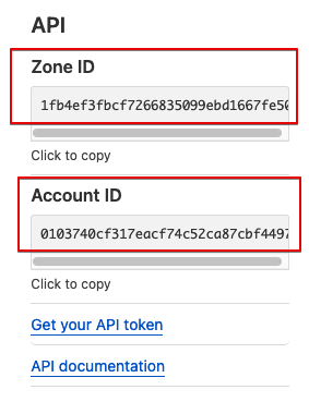 그리고 Account ID 와 Zone ID 는 Cloudflare 의 관리하는 도메인 화면에서 오른쪽 아래쯤에 API 그룹에 있는 Zone ID 와 Account ID 값을 복사해서 입력해주면 되겠어.