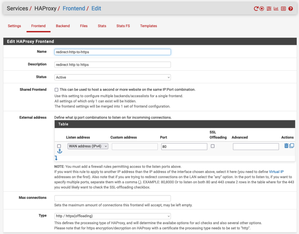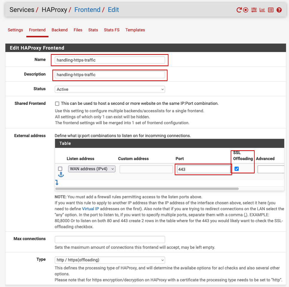 Edit HAProxy Frontend 구역에서는 Name 과 Description 항목을 입력하는 것 말고는 기본값을 수정할 항목은 없어.