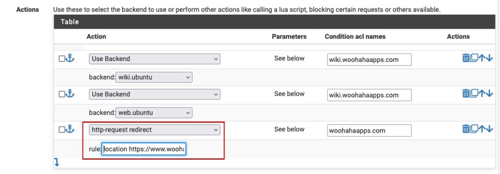 wiki.woohahaapps.com 도메인 주소 사이트가 운영되는 backend 항목, www.woohahaapps.com 도메인 주소 사이트가 운영되는 backend 항목을 정해줬어. woohahaapps.com 으로 들어오면 www.woohahaapps.com 으로 연결되도록 http-request redirect 를 선택하고 rule 값에는 location https://www.woohahaapps.com 이라고 입력해서 주소 이동이 되도록 했지.