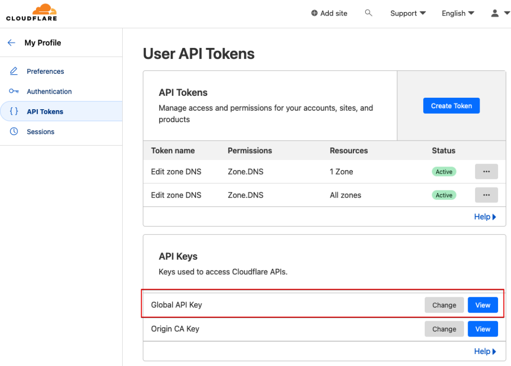 맨 위의 Key: Cloudflare API Key 항목의 값은 Cloudflare 에서 My Profile / API Tokens 화면에서 API Keys 목록의 Global API Key 의 값을 입력해주면 돼.