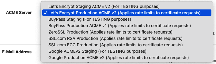 이중에서 Let's Encrypt Production ACME v2 (Applies rate limits to certificate requests) 항목을 선택해 주면 돼.