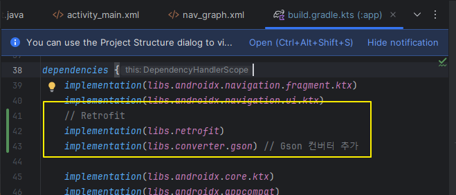 Retrofit 라이브러리를 사용하기 위해서는 프로젝트에 의존성 라이브러리를 설정해 주어야겠지.