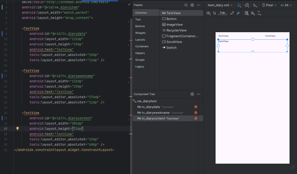 한 개의 일기 데이터를 표시하기 위한 뷰의 구성요소로 날짜를 표시할 TextView, 해당 날짜의 요일을 표시할 TextView, 마지막으로 일기 내용 데이터를 표시할 TextView 등 3개의 TextView 가 필요할거야.