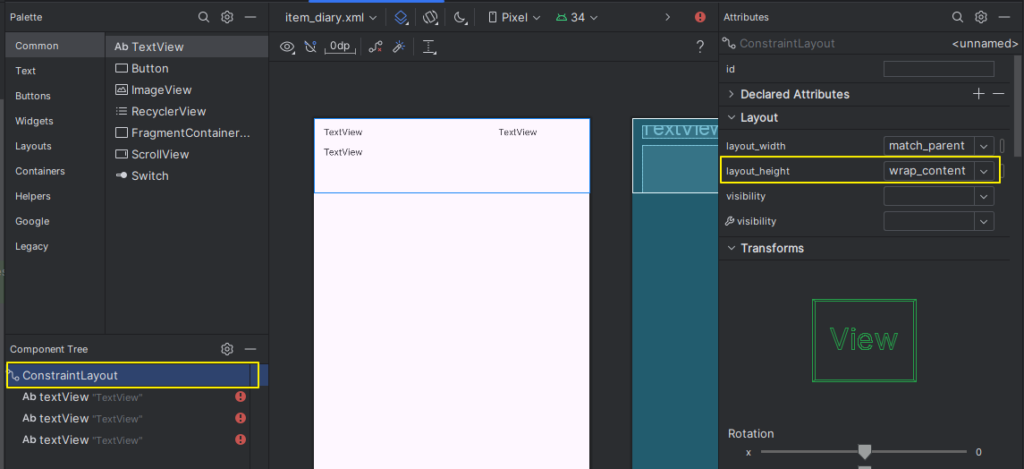 각 컴포넌트를 담고 있는 ConstraintLayout 의 layout_height 속성값을 match_parent 에서 wrap_content 로 변경하면 아래 그림처럼 일기 내용을 표시하기 위한 TextView 의 bottom line 까지 높이가 줄어들게 돼.
