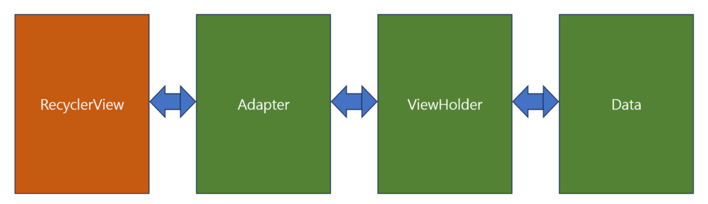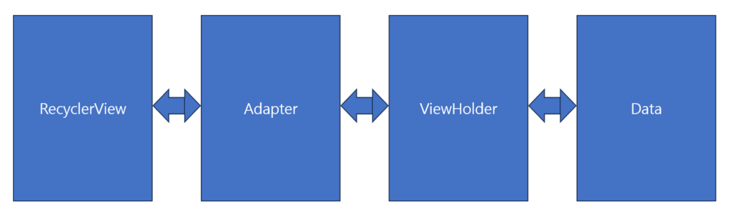 잠시 RecyclerView 에 데이터를 표시하는 과정에서 사용되는 구성요소에 대한 관계를 살펴보고 넘어갈께.
