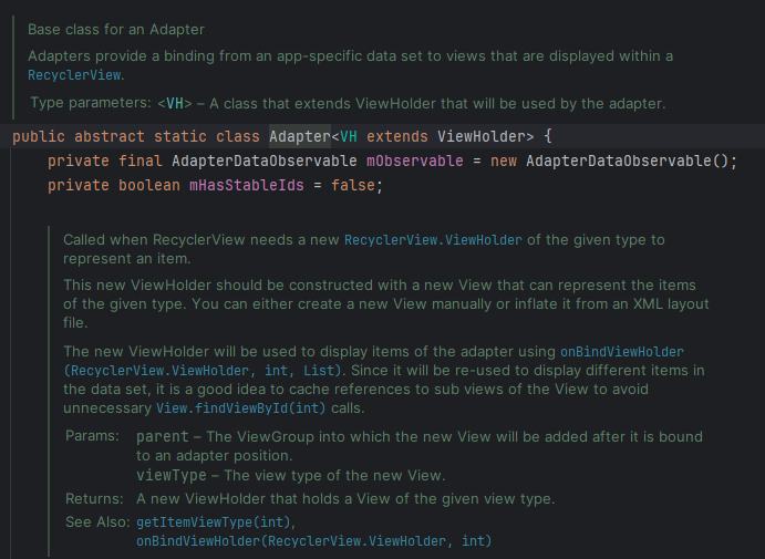 그 이유는 추상 클래스인 RecyclerView.Adapter 에 정의되어 있는 메소드가 아직 구현되지 않아서이기 때문이야.