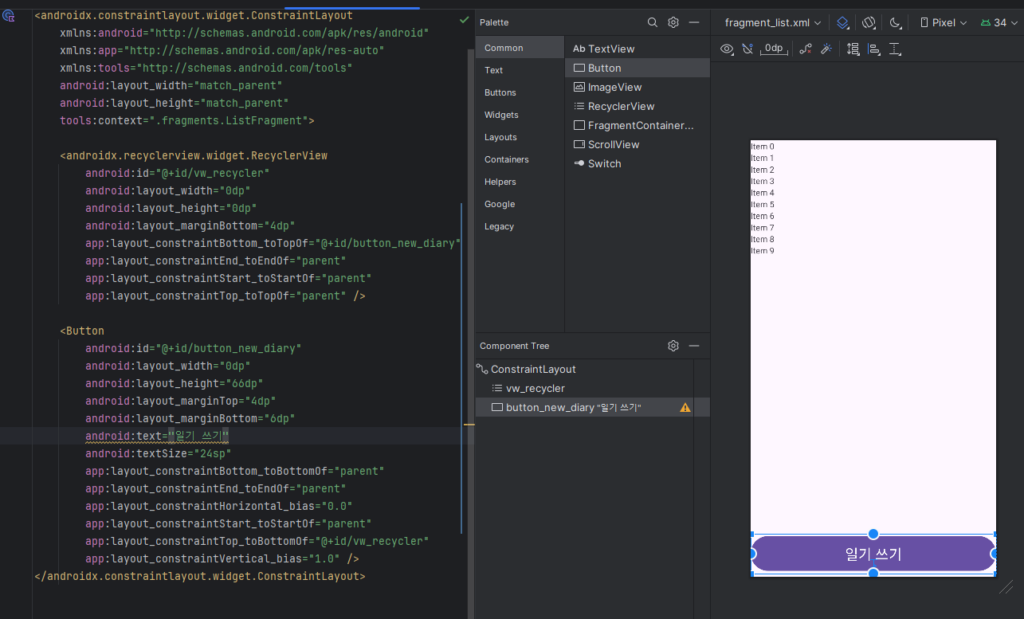 fragment_list.xml 에서 RecyclerView 하단에 버튼을 배치하고 새 일기 쓰기 버튼으로 사용하려고 해.