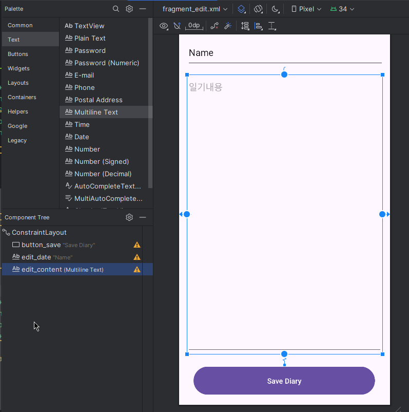 fragment_edit.xml 의 UI 레이아웃은 아래와 같이 구성했어.