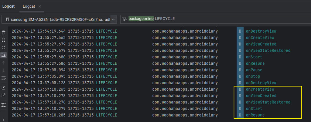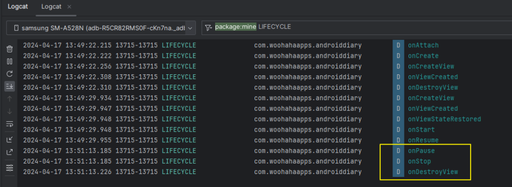 이렇게 LIFECYCLE 이라는 태그를 붙여서 로그가 표시되도록 작성한 다음에 일기 목록 에서 새 일기 작성 -> 일기 목록 -> 일기 내용 수정 -> 일기 목록 으로 이동한 결과 아래처럼 로그를 확인할 수가 있었어.